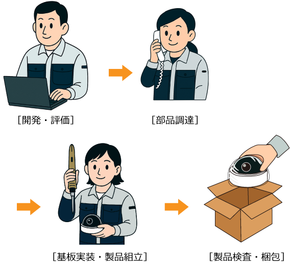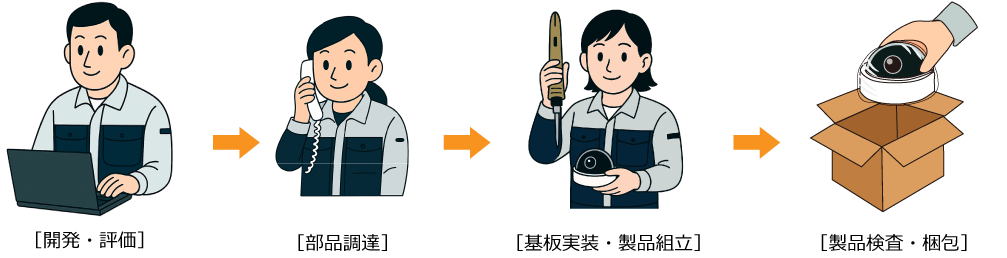 当社は、TOA株式会社の国内中核生産拠点として、セキュリティ監視機器や業務用音響機器の部品調達から製造・出荷までを一貫して行う体制を整えています。