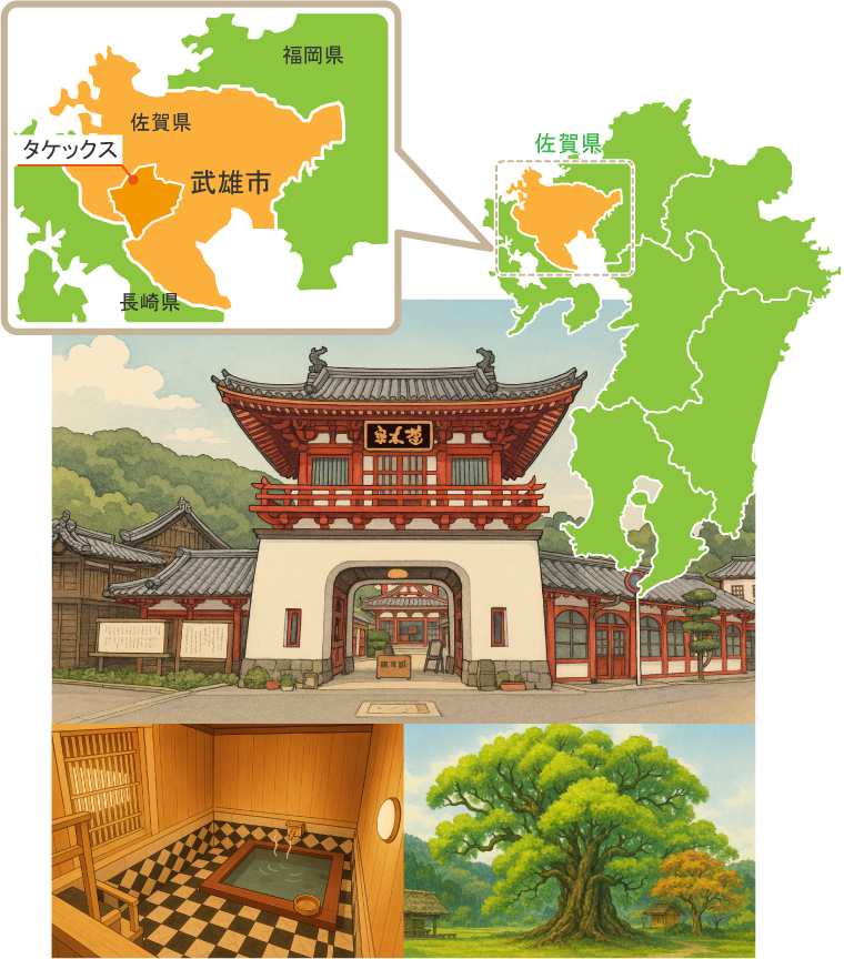 武雄市は佐賀県西部に位置し、佐賀市と長崎県佐世保市の中間にある交通アクセスに優れたまちです。2022年に開業した西九州新幹線により、長崎へは最速23分、博多へも約1時間で到着可能。都市部との距離を感じさせない、ちょうどいい立地です。このアクセス向上により、観光客数も大きく増加し、武雄は観光と交流のまちとして進化を続けています。市の中心には、1300年の歴史を持つ武雄温泉があり、「肌がすべすべになる」と評判の泉質が魅力です。