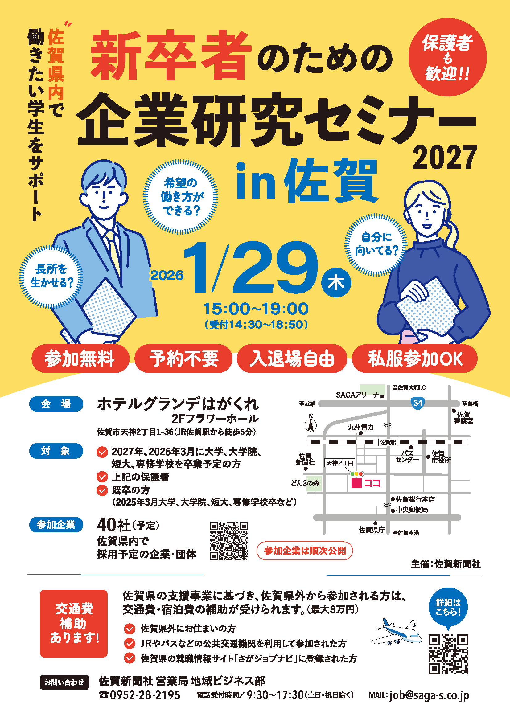 佐賀新聞社主催の「企業研究セミナー2027 in 佐賀」が、2026年1月29日(木)に「グランデはがくれ」で開催されます。